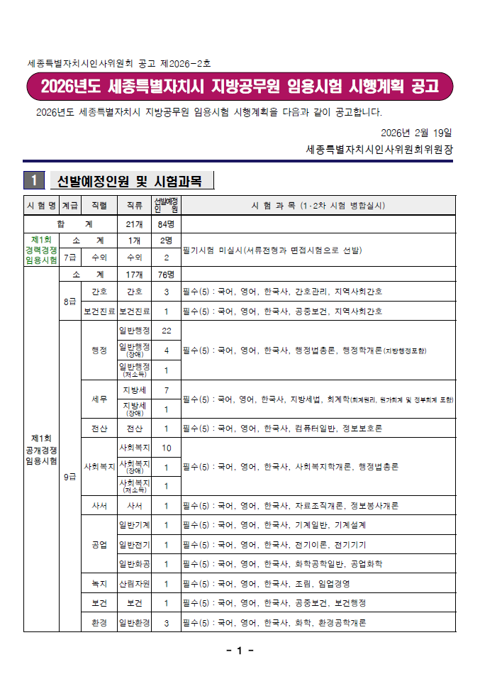 ¾È³çÇϼ¼¿ä, ÇØÄ¿½º°ø¹«¿øÀÔ´Ï´Ù. 2026³âµµ Áö¹æÁ÷ °ø¹«¿ø ä¿ë °ø°í°¡ ¹ßÇ¥µÇ¾ú½À´Ï´Ù. °ø°í¸¦ ÅëÇØ °¢ Á÷·Äº° ä¿ë Àοø, ½ÃÇè ÀÏÁ¤, ½ÃÇè °ú¸ñ, À¯ÀÇ»çÇ×À» È®ÀÎÇØ Áֽñ⠹ٶø´Ï´Ù. ** ¾ÆÁ÷ ¹Ì¹ßÇ¥µÈ Áö¿ª ¹× ±³À°Ã» ½ÃÇèÀÇ °æ¿ì ¹ßÇ¥µÇ´Â´ë·Î ¾÷µ¥ÀÌÆ® ¿¹Á¤ÀÔ´Ï´Ù. 1. ¿ø¼Á¢¼ö ¹× ½ÃÇè ÀÏÁ¤ 2. ¼¼Á¾Æ¯º°ÀÚÄ¡½Ã ä¿ë °ø°í (÷ºÎÆÄÀÏ ¹× °¢ ÁöÀÚü ÆäÀÌÁö Âü°í) ¼¼Á¾Æ¯º°ÀÚÄ¡½Ã ¼¼ºÎ ä¿ë°ø°í È®ÀÎ>