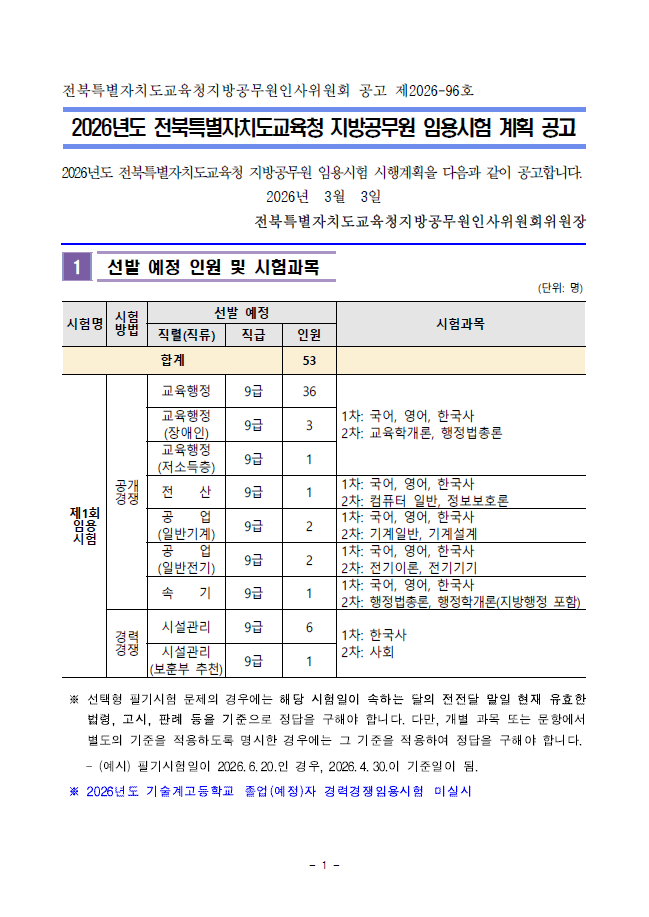 ¾È³çÇϼ¼¿ä, ÇØÄ¿½º°ø¹«¿øÀÔ´Ï´Ù. 2026³âµµ Áö¹æÁ÷ °ø¹«¿ø ä¿ë °ø°í°¡ ¹ßÇ¥µÇ¾ú½À´Ï´Ù. °ø°í¸¦ ÅëÇØ °¢ Á÷·Äº° ä¿ë Àοø, ½ÃÇè ÀÏÁ¤, ½ÃÇè °ú¸ñ, À¯ÀÇ»çÇ×À» È®ÀÎÇØ Áֽñ⠹ٶø´Ï´Ù. ** ¾ÆÁ÷ ¹Ì¹ßÇ¥µÈ Áö¿ª ¹× ±³À°Ã» ½ÃÇèÀÇ °æ¿ì ¹ßÇ¥µÇ´Â´ë·Î ¾÷µ¥ÀÌÆ® ¿¹Á¤ÀÔ´Ï´Ù. 1. ¿ø¼Á¢¼ö ¹× ½ÃÇè ÀÏÁ¤